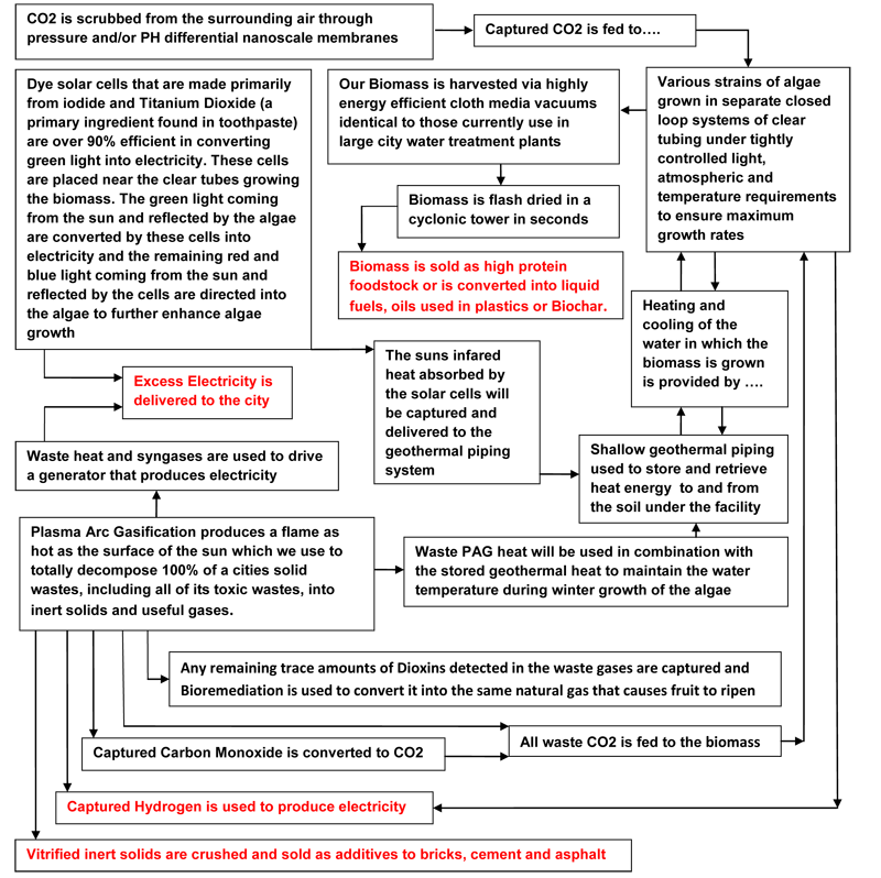 “Dedicated to naturally providing over 100% of the electrical and liquid fuel energy needs to any city in a sustainable and renewable carbon neutral manner while simultaneously removing 100% of a cities existing and future solid wastes and removing millions of tons of CO2 from the surrounding atmosphere”